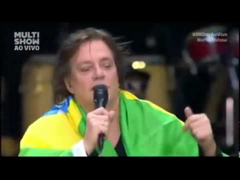 à plateia sobre o a inscrição na bandeira nacional. Logo em seguida, o cantor afirmou